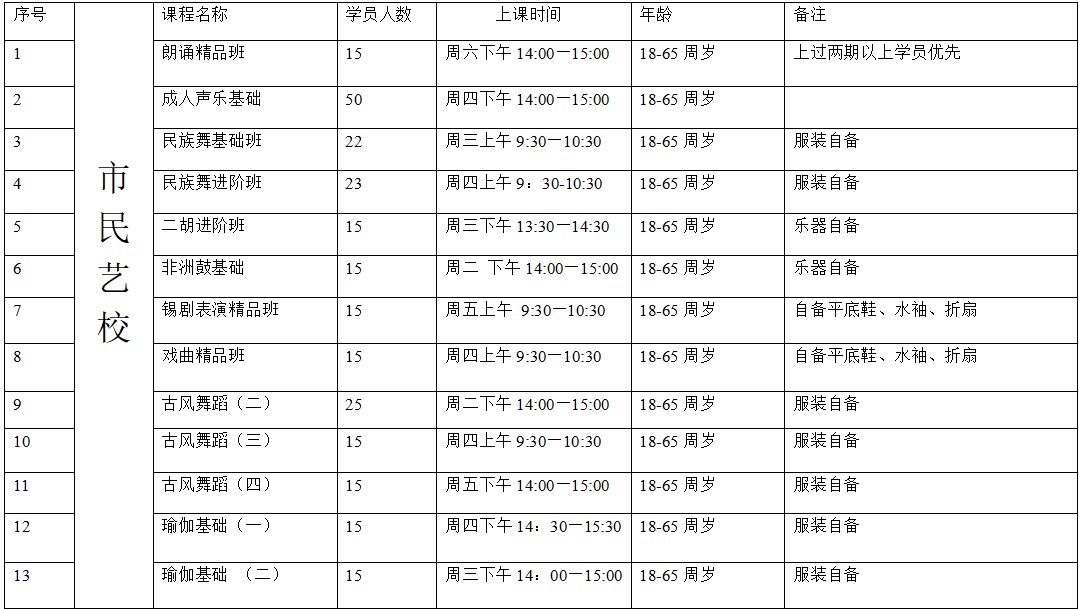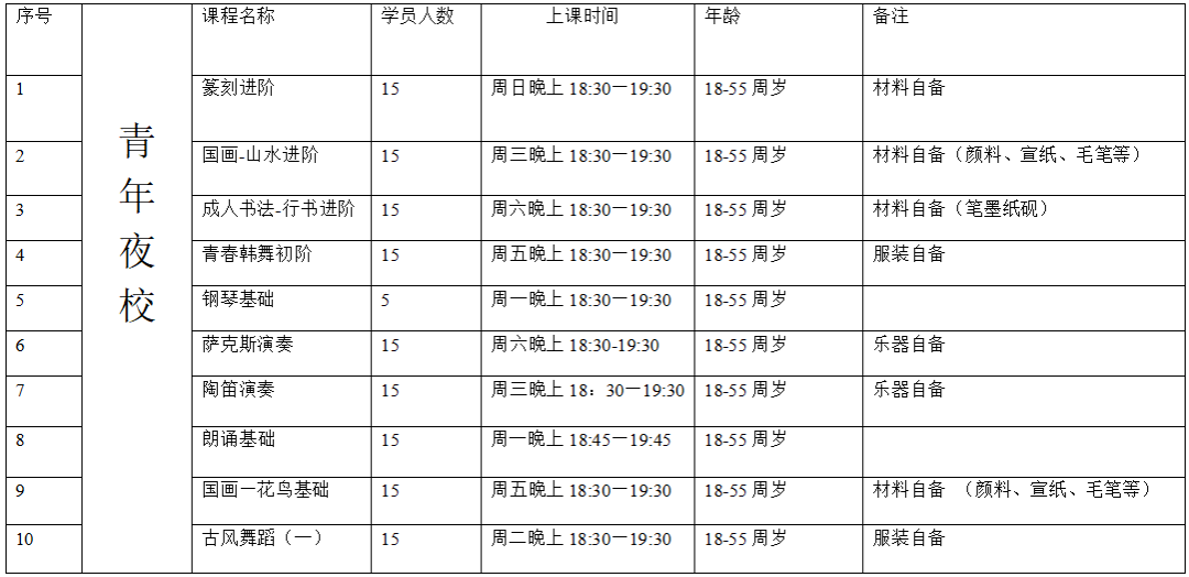 面向全市市民爱好者,青年夜校(18-55岁),市民艺校(18-65周岁),每人限报一门;每项课程报满为止(需材料费的课程请学员在首次课程时交于老师)
