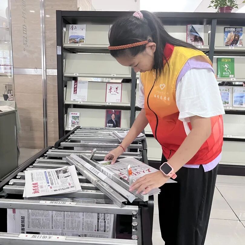 看似轻松的任务,背后需要志愿者们有足够的耐心,穿着红马甲的志愿者忙碌在图书馆的成人、少儿、少儿绘本区、报刊各个馆室里,摆放整齐的书籍、荐购图书的小黑板、暑期为小读者提供的亲子阅读区,除此以外,采编新书、图书下基层也有他们的身影。暑期正是有了他们的服务,图书馆的读者才拥有了更好的阅读环境。