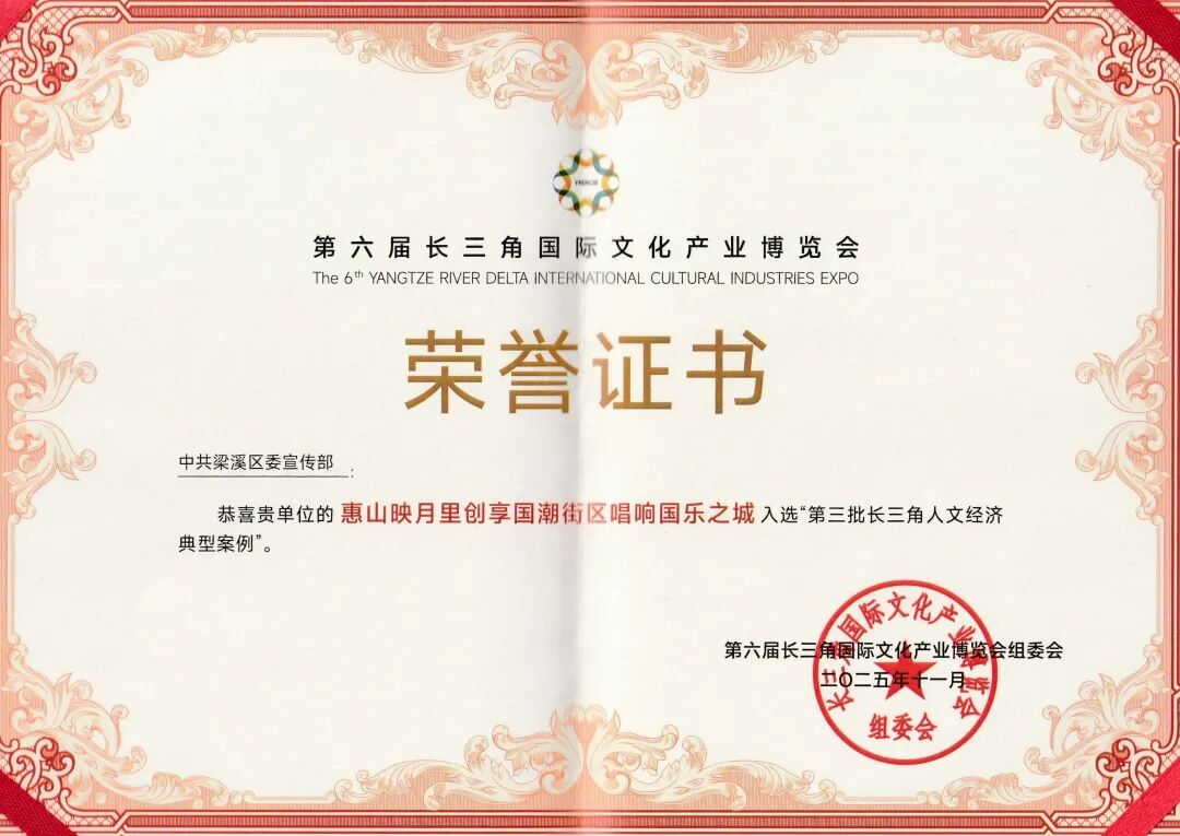 无锡市梁溪区惠山映月里街区地处惠山脚下、大运河畔,是大运河文化带建设的重要组成部分,也是2025年总台春晚无锡分会场沉浸式拍摄的主舞台。街区以二泉映月为文化IP,以国潮艺术生活方式为场景,打造“文商旅+文化IP+音乐+国潮艺术”为体验模式的“国乐之城”,持续厚植无锡“世界音乐之都”底色。2025年11月入选第三批长三角人文经济学典案例。