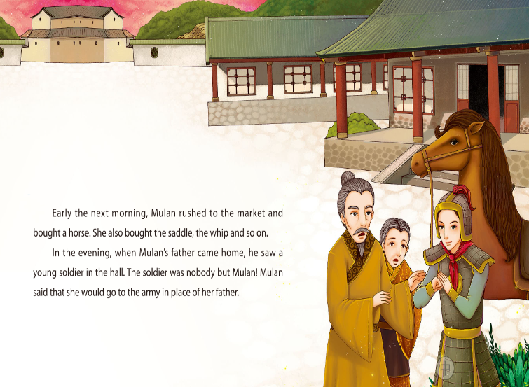 第二天,天还没亮,木兰就飞快地冲出家门。她来到集市上,挑了一匹毛色鲜亮的骏马,又配齐马鞍、马鞭等。