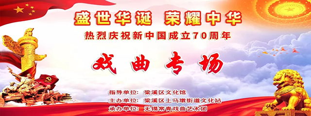 为全面展示、传播中华优秀戏曲文化,7月8日下午一点,由上马墩街道文化站举办的“盛世华诞 荣耀中华”热烈庆祝新中国成立70周年戏曲专场将在梁溪区文化馆七楼剧场举行,届时将有锡剧、沪剧、越剧名家倾情献演。