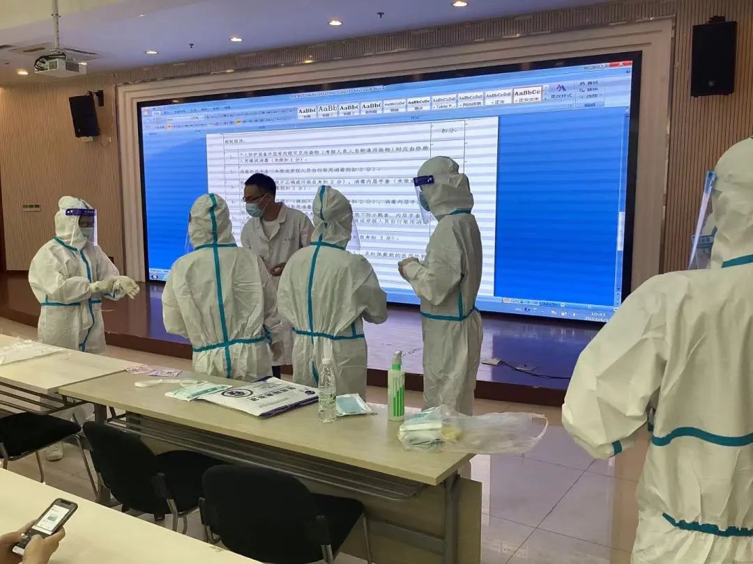 理论讲解后,大家还在现场进行了防护服穿脱,医生在旁边观察并指出大家的不规范之处。比如时刻注意手消毒,脱的时候尽量不要碰到里面的衣服,防护服往下卷等。