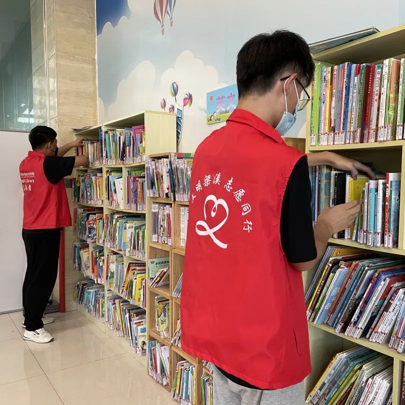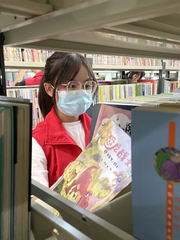 在图书管理员的指导下,着装统一的小小志愿者们完成了 “上岗前”的技能培训,并进行了实操训练。小小志愿者们主要负责把读者归还的书籍重新上架以及整理书架并保持书架整齐。