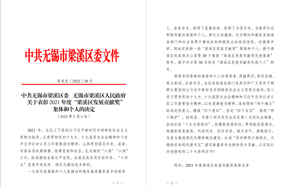 荣获2021年度梁溪区高质量发展贡献奖