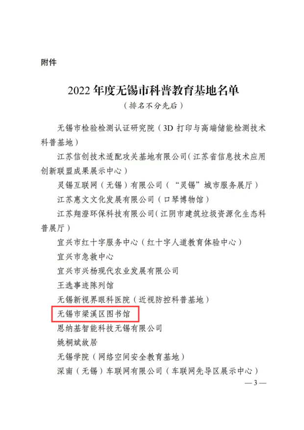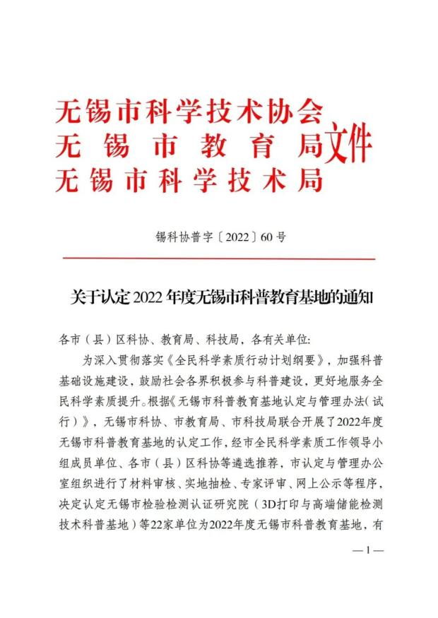 荣获“2022年度无锡市科普教育基地”称号