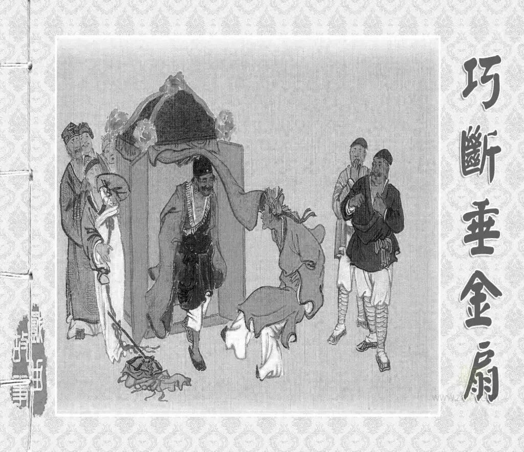 连环画《巧断垂金扇》改编自《济公全传》相关回目,讲述济公巧施妙计惩罚恶霸,使李文龙夫妻团圆的故事。李文龙虽一贫如洗,但妻子郑氏温柔美貌,一家人日子和睦。恶霸卞虎垂涎郑氏美貌,设计栽赃陷害。李文龙发现妻子“私通”的证物垂金扇,一怒之下休妻。济公发现隐情,定下巧计,惩罚了居心不良的卞虎,李文龙夫妻也和好如初。
