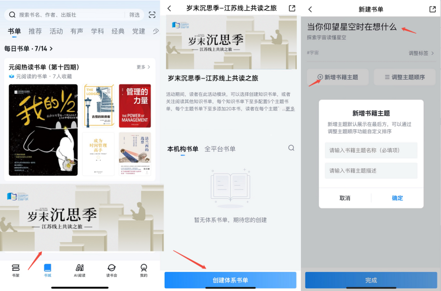 (1)创建知识书单:添加知识书单主题->添加书籍主题名称->添加书籍->完成
