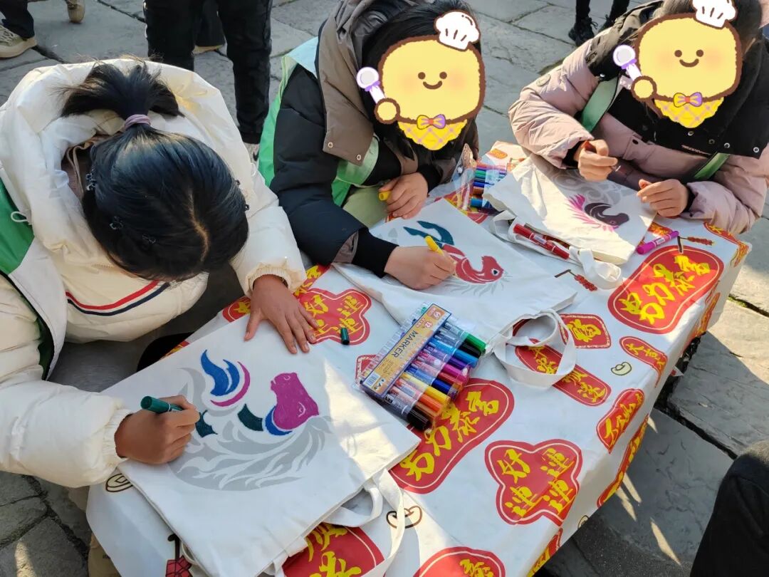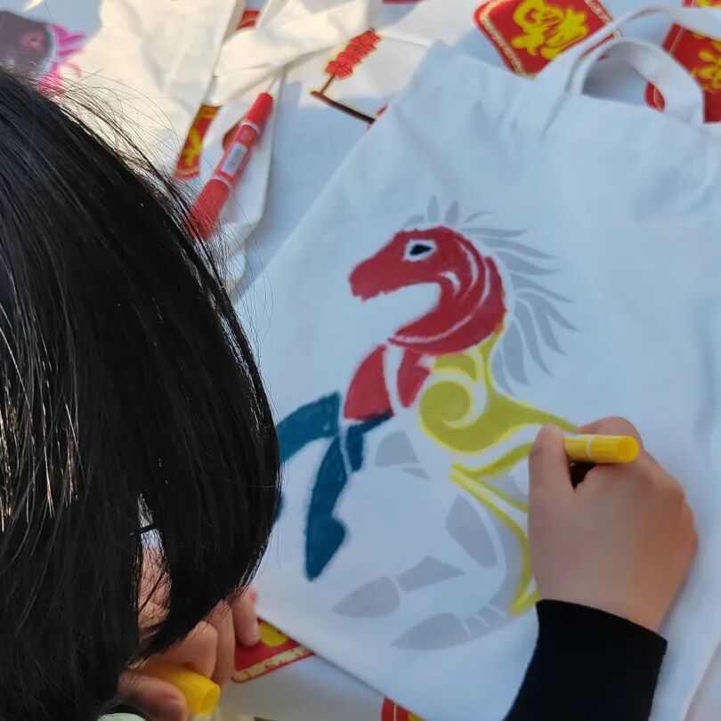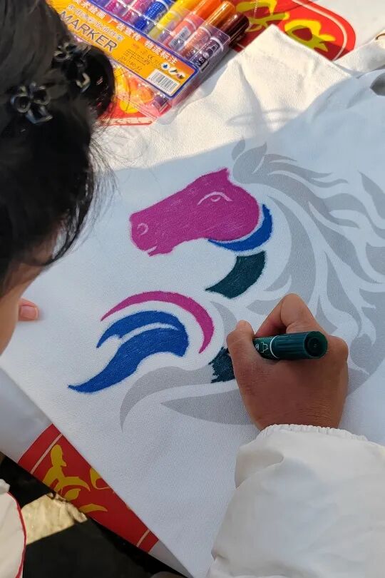 马蹄声声近,孩子们在老师的引导下,在空白帆布袋上以奔腾骏马入画,寓意新年一马当先、前程万里。孩子们笔下的马儿也充满了他们自己的想象,颜料与童趣一起迸发着和谐的新生。